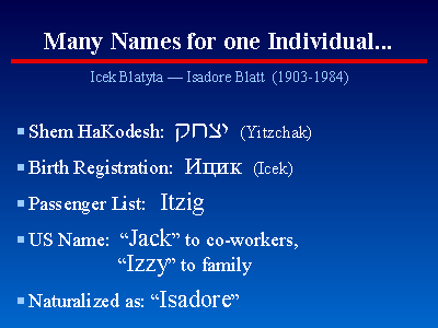 Most people have several different names. Here's an example. My grandfather, who had the Hebrew name "Yitzhak". His Yiddish name was "Itzik" (spelled "Icek" in Polish), the Yiddish version of "Yitzhak". After immigration to America, he was called "Jack" by co-workers, because they couldn't pronounce "Yitzhak". "Yitzhak" became "Izzy" among family, and he was naturalized as "Isidore".
