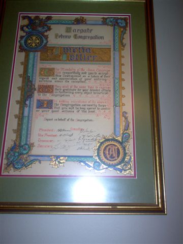 It was mainly her determination, efforts and fundraising that saw this come to fruition. Family and friends were all “strong-armed” into donating. My parents, Cicely and Jack Levy, donated one pair of doors to the sanctuary, my aunt, Sadie Hillman, donated the other set of doors, and my uncle and aunt, Marie and Asher Gold, donated one of the windows. Incidentally, she later worked to get an area of the Margate Cemetery separated off as a Jewish cemetery and she is buried there, as is my uncle, her son, Asher Gold.