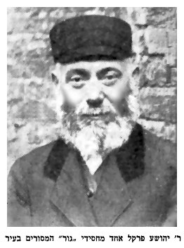 The father was one of the Chassids of the Gur Rebbe and would, from time to time, travel with one of his sons to give a pidyon (redemption) and receive a blessing. He was an active public figure in the Jewish community, and was concerned about all of the religious poor. He oversaw the appointment of the first rabbi of the town, and when he died he ensured there would be one who followed him, so that the town would not be without a rabbi, who was needed to rule on various questions of kashrut and to arbitrate disputes, perform marriages, support the poor so they could prepare for the Sabbath, and invite a guest for the Sabbath from those at the synagogue. He would lead the prayers and read from the Torah, and on the High Holy Days he blew the shofar.