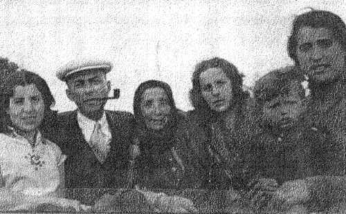Your cousin Howard Hiatt sent this picture. This is Henneleh [far left]. Next is Al, who came to visit us; that's the way Al looked. Next is my mother, then myself. This [small child] is Bereleh. When the war started, he was about fourteen or fifteen years old. This is Chaya [far right].