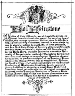Well, dear children, my story ends. Remember you ancestors from Lida and from all Lidas where the spirit of Freedom was crushed; help revive the hope for an end of the Martyrdom of Man. Help build a Brotherhood of Free Nations of Free men. In calligraphy: Sol Feinstone/Native of Lida, Lithuania; son of Joseph the Scrive, endowed from childhood with repect for learning, love of freedom, and courage to venture. Atrived alone in New York, 1902, a penniless boy of fourteen; labored in sweatshops by day to study for college by night. One of first graudates 1915, New York State College of Forestry at Syracuse University, master's degree in chemistry, Syracuse 1916. Navy chemist during World War I. graduate student in economics University of Pennsylvania; resident of Buckstone Farms since 1945. Dedicated savings to help safeguard America's physical heritage and to promote the Spirit of the American Revolution as the struggle for Free men to remain free. Founder, the David Library of original manuscripts on the American Revolution at Washington Crossing; donor, land and library building for elementary school Upper Wakefield Township; donor, valuable collection of original manuscripts and books on the American Revolution to Trenton State College. Americans of this and future generations are indebted to this adopted son for his dedication to the cause of freedom.