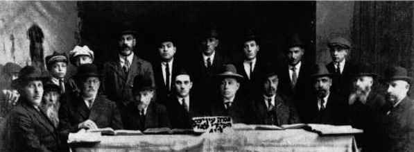 Seated from right to left: 1. The teacher Nizvodsky; 2. The functionary Michael Stoctor (the medic); 3. Not identified; 4. Ze'ev Sokolovski; 5. Not identified; 6. Elchanan Yishayahu Kaminetzki. |