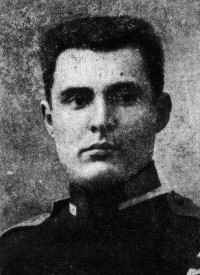 | Moshe Fleischtsik, a soldier in the Tsar's army, the son of Shimon Leib, the head of the Jewish folk musicians' band in Slutsk | A group of soldiers from the Hebrew regiment in 1918. Among those sitting from right to left - the second Shlomo Simbol, now in Yad Eliyahu (the son-in-law of Shimshon Leib Fleischtsik of Slutsk) |