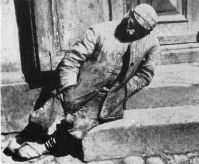 After that festive gathering, which went on long into the night, the guest missed his train back to Warsaw. No one had thought of cutting things short, because everyone was in such a festive mood. When the guest discovered that he would have to wait until the next morning for a train, he settled down in earnest to respond to the questions posed by the gathered audience. Long after the townsfolk were fast asleep behind closed doors and shuttered windows, a group of young people in town remained with their guest. The group that escorted Hillel Zeitlin looked like a tzadik (pious, saintly man) surrounded by his Hasidim (his devotees) that went outside into the street for some fresh air that wafted a refreshing breeze under the dancing stars on the dark blue curtain of the sky. When they neared the woods, a smart elderly man ran over to the guest and heartily embraced him. This elderly man spoke with enthusiasm of Zeitlin's scholarship and mental acuity. In the meantime, the group made a fire and sat around it on stumps of sawed-off trees. The elderly man sat on a crate, close to the bonfire. His face was illuminated with sweet contemplation in those dark woods. He said that many years ago, during the time of Rabbi Shloymele Ayger, the popular, great Torah scholar of that time, Wyszków had been blessed with a Jew, who, although he was not a Torah scholar, devotedly prayed to G-d in his own way. He was ready to sacrifice himself for the Jewish community every minute of every day. Such kind of Jew was Hershele Wasertreger (water carrier). The root of today's songs and tunes can be found, if one will search in Hershele's melody: Uru-na, kumu-na, Hito-reru! (Please wake up, please get up, awaken you all)! (This melody) carried with crystal clarity and pleasurable tremolo over the Jewish houses in the hospitable silence of the pre-Sabbath night. That was his psalm, his song to the Creator. It is said that with the edges of his frock-coat tucked into the back of his belt, he would fly past the closed shutters with the ease of a deer and with great love wake up the Jews of Wyszków, so that they could recite tilim (the psalms) and sing religious song of praise to the Creator of the world. For him it was the most beautiful song. It was one way for him to connect with eternity. Huru-na, kumu-na, (Please wake up, please get up) he said through the shutters, and people wanted to get up and wash negl waser[7]. Hershele's melody was full of compassion, and the evil inclination to sleep more could not overcome it. The melody asked: Lemah ragshu goyim? (Why do nations rage?)[8] and doors opened; Jews had gotten up to recite the psalms. This is how he earned his place in the oylom-habeh (World to Come). He was girded with sanctity, when he heard the footsteps of Jews on the streets that barely touched the ground.