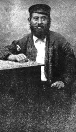 and had a dark skinned face. From one side, he appeared gloomy, as if he was terribly offended about someone or something and was on the edge of anger. But on the other side of his face a smile played that was calming and reassuring, as if to say, Come on, I'm only joking. His manner of speech was also unique. He didn't begin in the usual manner, first, then second, but immediately proceeded to third, what is there to say? At prayers on shabes, he would chant one of the blessings to the melody of The Internationale. He had read a lot and the young people who were attracted to culture made use of his books.