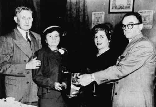 Mr & Mrs Morris Haitt greet in the name of the Association, Mr. & Mrs. Nathan Gottlieb and present, as a symbol of recognition and thanks for their relief work, an electric boiler as a gift. This picture was taken in the year 1953. |