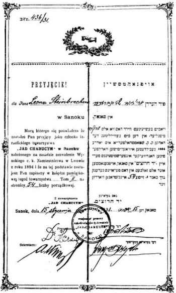 The first president of Yad Charutzim was Dr. Natan Nebenzahl. He lived in Sanok until the First World War (1914), and gave a great deal of his energy for the good of the organization. He remained the honorary president of the organization even after he left Sanok to move to his new residence in the Austrian capital of Vienna, where he died. His large portrait took an honorable place among the rest of the portraits of the members of Yad Charutzim on the second floor of the building. The members also paid monthly dues, collected by the shamash (beadle) of the synagogue, Yitzchak Krell of blessed memory.