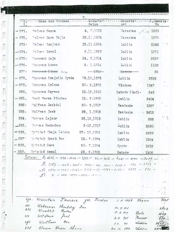 "The list of the Lublin Jews is part of the archival collection of the Lublin State Archive [including] the collection of the documents of the Lublin`s Judenrat. The list was prepared in April 1942 after the deportations from Lublin ghetto to Belzec. On the list are only the people who got the J-Ausweis from the Germans and permit to stay in the small ghetto on Majdan Tatarski in Lublin. Of course, except those people who are on the list, there were "illegal" people in the ghetto too. I know it from the survivors... Children under the 14 year [are not on the list; however, the children were in the ghetto, too.