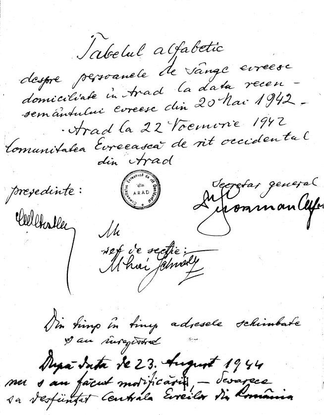 [signed] Arad, 22 November 1942, the Jewish community of Occidental [Neolog] from Arad. President, General Secretary, and Chief of Section.