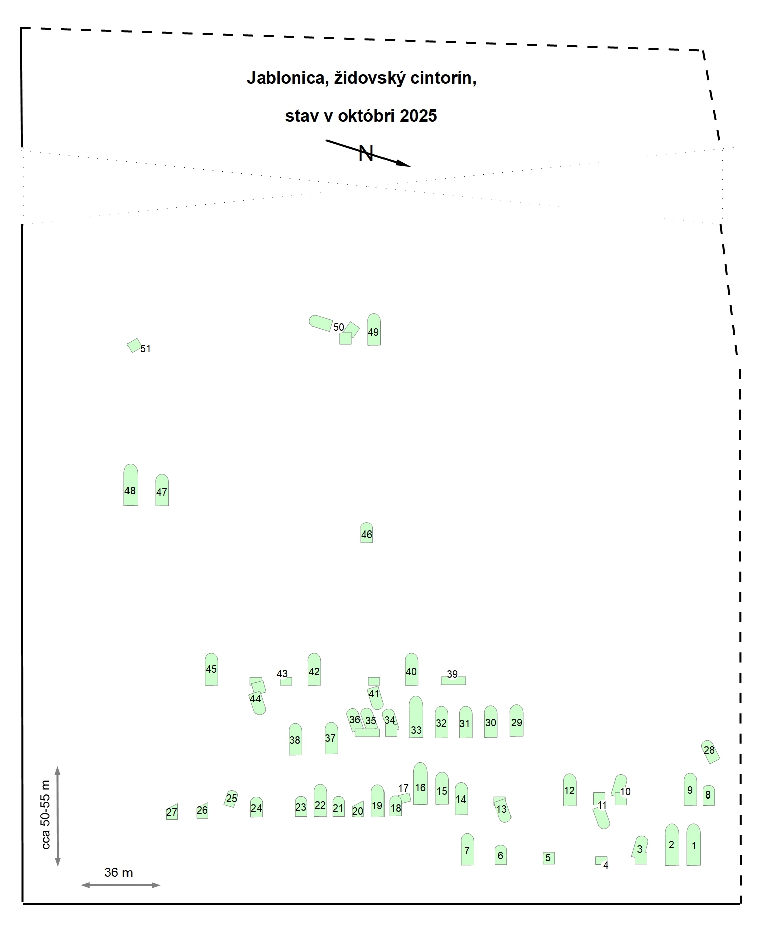 Small abandoned and overgrown cemetery in the village Jablonica. Before taking photos, a group of volunteers cleaned part of the cemetery. There are 51 tombstones or their remains in the cemetery. 44 names of the buried were identified. The cemetery map was made by Mr. S. Chromek, who also provided several photographs from the past. His website is: https://kriz.epocha.sk/zidovske-cintoriny/zidovsky-cintorin-jablonica/.