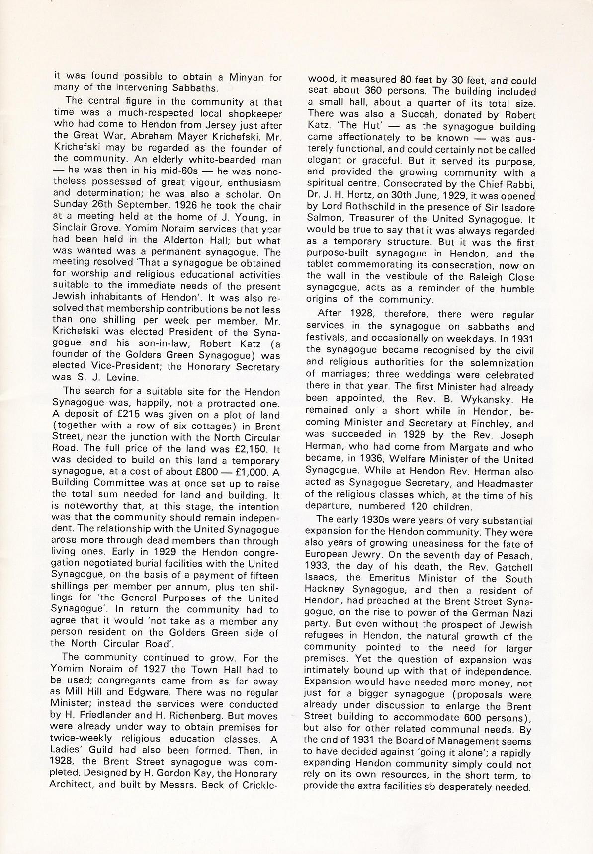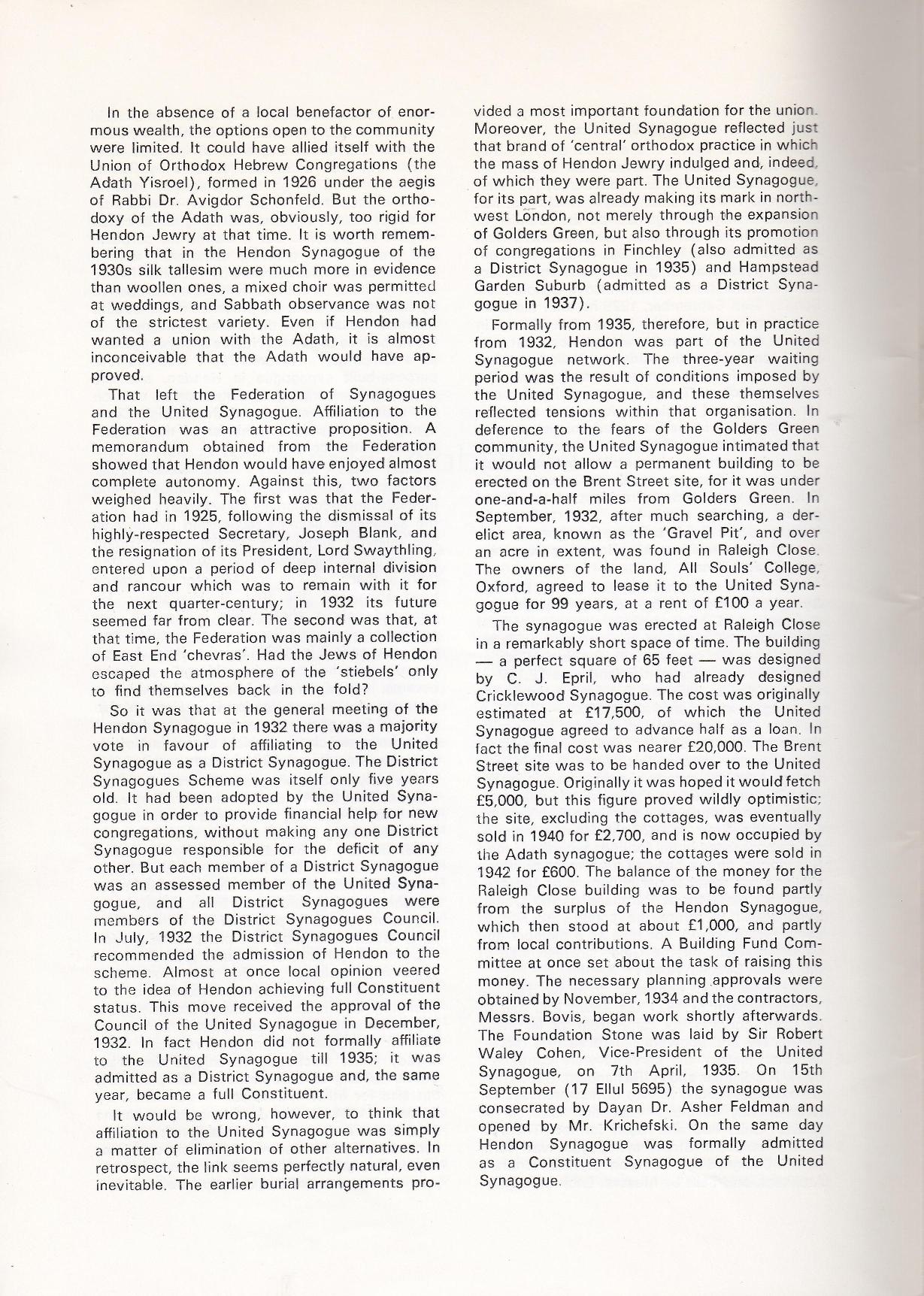 The History of the Hendon Synagogue 1928 - 1978 by Geoffrey Alderman