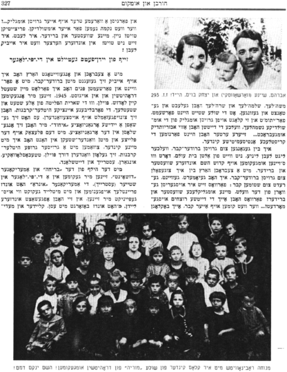 [photo:] Pinya and Mindel Siderov, daughter Friedel (standing), son-in-law Yisrael London (seated) and grandchildren: Yoel, Moshe, Yankel, Yudel, Sarah-Reizel, Chaya-Gittel and Yitzchak. A son of Pinya is standing on the left, and a girl in the middle of the top row. The entire family was killed by the German murderers! May G-d avenge their blood!