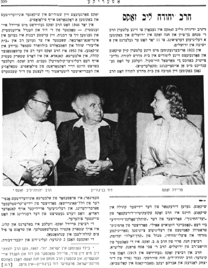 In 1919 David married Hendel Hausman, a daughter of R. Zelig and Sirka Hausman, and in 1920, he took his family to Chicago in the United States. In Chicago, David found wide opportunities for community work. He served for many years as a Board member and trustee of the Kehilat-Yaakov synagogue and Talmud Torah school at Douglas and Hemlin. Today he is the honorary chairman of the Board of Directors of the new Kehilat Yaakov and Beit Shmuel synagogue; he is president of the Anshei Drohitchin Cemetery; a Board member of the Agudat-Achim South Shore synagogue; a member of the Board of the Knesset Yisrael synagogue in Miami Beach, Flordia, and is a member of the Apollo Masonic Lodge. He [is] also a member of the Shomrim Zionists and other organizations.