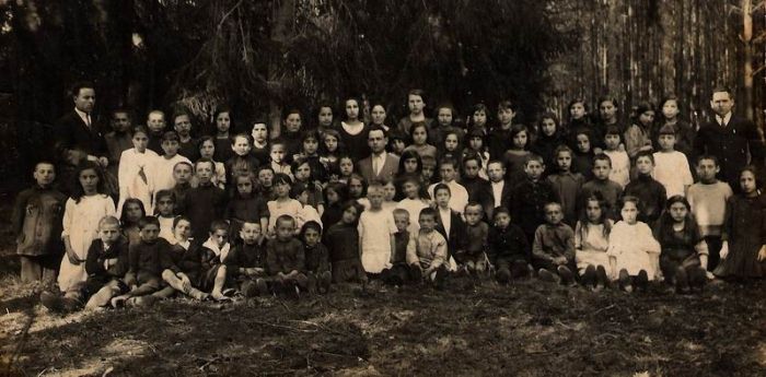 Seated: Libke Kasimov, Lanka (62) and her brother Moishale Visakolsky (63), Moishale Zeif (64), Honke Glick (65) (son of Rochl-Leah), (-), Motale Slep, Beinish Yudelowitz (68), (-), (-), (-), Tzalke Zalkind, Shmuel Levitt (73), Reuven Milun (74), (-), (-), Sheinke Yossman (76) and Rivka Pores (78), Micha Baron (79)