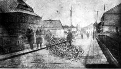 Shabes morning. The whole town was burning like the fires of hell. Dead Jews lay in the street. Germans caught me and started pressing me and another few hundred Jews toward Germany. We arrived in the town Ruzshan. They drove us into a bombed-out church and pressed us all into small space. Pondering the bitter situation, I recalled a remedy from a great sage, that when one finds oneself in danger for one's life to recite the prayer Nishmat kol khay a certain number of times. Not thinking a lot, I began to recite Nishmat. After a few repetitions, a German came in and called out my brother-in-law Nakhman Yozshambek may God avenge his blood, who was sitting near me. I kept saying Nishmat with strong intention. When I finished the whole number, my brother-in-law came back with two tomatoes. My heart felt a little lighter. I took that as a sign that the remedy had helped, and that I would with God's help survive this trouble.