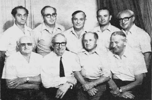 Standing, right to left: Yosef Nudel, Yisrael Hustik, David Erlich, Moshe Vald, and Eliyahu Nudel |