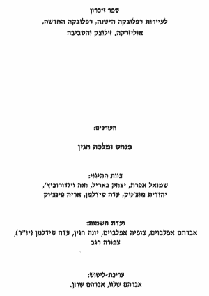(Memorial book for the towns of Old Rafalowka, New Rafalowka, Olizarka, Zoludzk and vicinity),