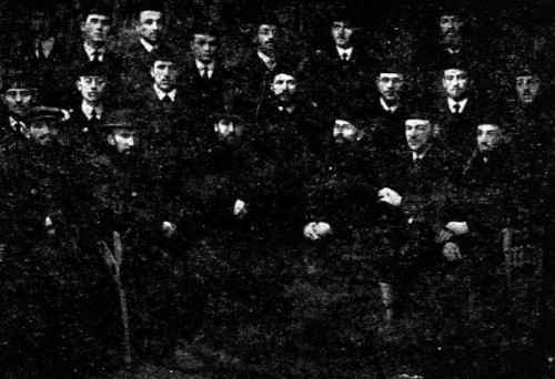 First row, standing from the right: Arn Shiglits, Khayiml Lifshits, Arn Rozenboym, Yitskhok Shevats, unknown, Moyshele Lifshits, Yekhiel Muster. Second row, from the right: Leyzer Moshkovits, Bunem Tugetman, Khatskel Nayman, Yekhezkel Levkovits, Shmuel Bak, Mordkhe Shtern, Yenkl Vudki. Third row, from the right: Zelik Shenitser, unknown, Betsalel Daytsher, Rabbi Melikovski, Lipman Karp, Eliezer Freylekh. |