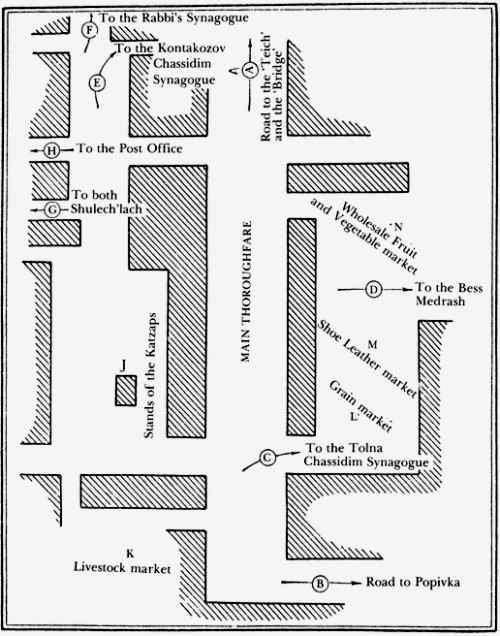 From the end of the dike (Bridge) a long and wide street passed through the middle of the town westward until it met the road to the village of Popivka. In the lower end of the street, nearer to the Bridge, was the market place. Here were stands for fruit and vegetables, fish and poultry. Here began the rows of stores which lined both sides of that street, right and left. On the upper end of the street were residences and most of the workshops of the wagon makers and blacksmiths.