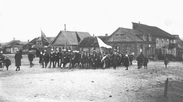 We walked in scouts' uniforms and the Lithuanians welcomed us in a friendly manner In the background (from right to left): Ziv's inn (on Unter dem Brik); houses belonging to Avraham-Isaac Yoffe; Hanna Aires (Chatzkel), brothers Asher and Zalmen Kagan and Hillel Schwartz (on Maskevitcher Gass) |