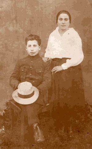 | Dovid-Leib Aires with his future sister-in-law, Feigitzke Pores, waiting for her fiancé Moshe-Yitzchak Aires, who was taking his time in Hachshara, 1925 |