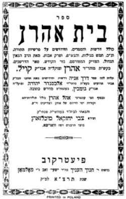 The book Beit Aharon includes sermons for holidays and festivals, especially the days of Shabbat HaGadol. It also contains eulogies for great rabbis of the Torah, including Reb Chaim Urban of łowicz and Reb Akiva Eiger of Poznan. It also contains novellae on Torah Parashiyot, Tractate Avot, commentaries and a sermon on the five scrolls, and ends with a will to his sons filled with musar words.