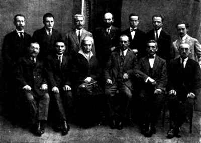 Seated right to left: Yosef Milstein, A.M. Weisbrot, Yitzhak Gitlis, Tsippa Roiter, Moshe Fishman, Moshe Dodiuk Standing right to left: Asher Frankfurt, Yaakov Klonitsky, Bernstein, Korman, Goldstein, Shalom Rabiner, Haim Ber |