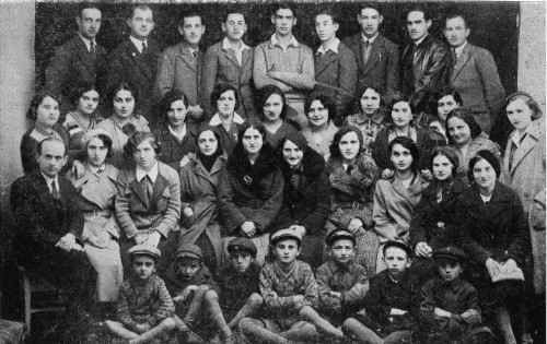 Bottom row from right and sitting: Anmut, Feier, Estlein, Kesten, Anmut and Estlein Sitting from right: Batyah Horowitz, Batyah Kesten, Failshus, Esther Amant, Kezshtecher, Mania Engelberg, Chaya Katz, Rachel Sapir and Nachman Kestenbaum Standing from right in third row: Dvora Lipschitz, Ethel Kneller, Dina Kornblau, Bronia Milrad, Dvora Feier, Rachel Shusheim, Chaya Feier, Leah Sapir, Itka Adler, Mania Failshus, Esther Anmut and Pesil Zgil Standing from right in 4th row: Pinchos Fast, Yitzhak Greenbaum, Yaacov Drefler, Motl Fast, Gedalja Estlein, Chaim Stempel, Dov Regenbogen, Akiva Landau and Yehuda Marder |