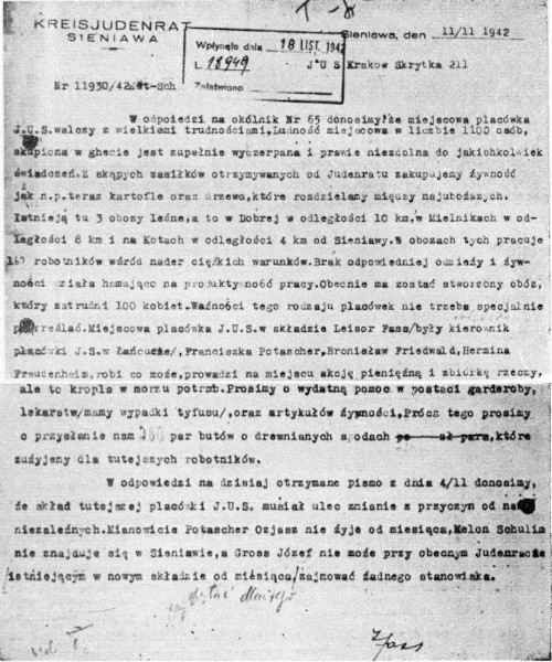 | The Jewish District Council Sieniawa, Jaroslaw District, to the revered (P.T.) Zydowska Samopomoc) The Presidency-Krakow. We would like to inform you that a Jewish self-help has been organized of the following composition: Leizer Fas, who was the chairman of the Lancut District Committee, now in Sieniawa, Franciszka Futczerowa, Bronislaw Fridwald. We would like to come in contact with the presidency. We are here a Jewish population of one thousand and three hundred people that were concentrated from the entire Jaroslaw district and reside in a stacked-up quarters. The Jewish Council supervises three labour camps in the forest and we are in dire need of financial help. The community doesn't have any means of sustenance and we are not able to extend any help to the needy. Therefore, we are appealing to the self-help Committee and pleading for financial or similar to a financial grant. (Stamp)