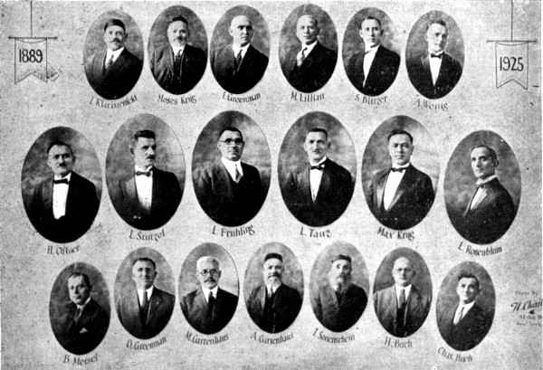 Seated from right: Tuviah Zonenshein, Melech Wolf Rauch and Alter Gartenhouse Seated in second row from right: Gustav Shwebel, Gartenhouse, Kalman (Charles) Buch, Baruch Greenman, Yaacov Flashen, Luzer Shtitzel and Moshe Lilien Standing in the third row: Rabbi Abraham Zawada, Abraham Yasem, Sam Shiffer, Max Shanc, Abraham Shanc, Leibish Frihling and Joseph Zawada |