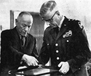 | M. Feinstone, a leading collector of Washington manuscripts in U.S., discusses letter with Maj. Gen. James B. Lampert. -The New York Times |