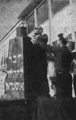 Standing from right to left: Musi Kraidbord, Chaim Finkel, Chaim Sachish, Esther Shapira-Guterman, Eliezer Stol (Shatil), Avraham Rosenthal, Tanya Leikechmacher-Venderiger, Aryeh Shukhman-Shaham, Miriam Vaynshelboim, Izzy Bronstein |