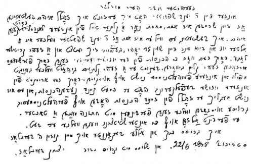 To my old and very beloved friend!Our sages wrote: The world is based on three principles: Torah, worship, and kindliness. As you probably still remember, our shtetl is known for its piety. People studying Torah, praying with devotion, but the fulfillment of acts of kindliness comes a little harder because of poverty in our town. Providence wasted the completion of the three abovementioned merits. Therefore, he made you immigrate to the United States and find there a good, free life. You ought to be thankful and fulfill the great mitzva, doing acts of kindliness. You should express your gratitude for going to the United States, as Joseph did to his brothers for going to Egypt. This should enable you to extend a helping hand to your impoverished brethren of Strzyzow. Dear beloved brothers! You cannot imagine the present situation. It cannot be described on paper. In this case it is a man, a great scholar, who is satisfied with as little as possible. He served us for the last fifteen years, his salary keeps decreasing, and nobody here is able to help him. It is a great merit to help a Jew, especially a great scholar. And in addition, he is also in need of dowries for his daughters which are, as described by our sages, a mitzva without limitations. We should not and cannot permit girls to remain unmarried. I plead with you, do not ignore it. Dear brothers! Make an effort and support this man, Rabbi Yacov Shpalter, and as a reward for your charitable deed, the Creator will help, fulfill, and answer all your prayers. You will become prosperous and live happily and in richness. Gd willing we should be able to convey to you only good news. This is the wish of your acquaintance and best friend. Please give my regards to all our landsleit, especially to Mr. Mussler, and Zalman Berglass who, I heard is very generous.